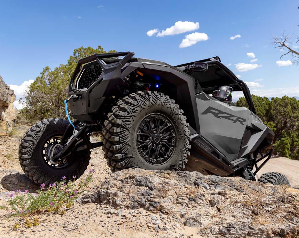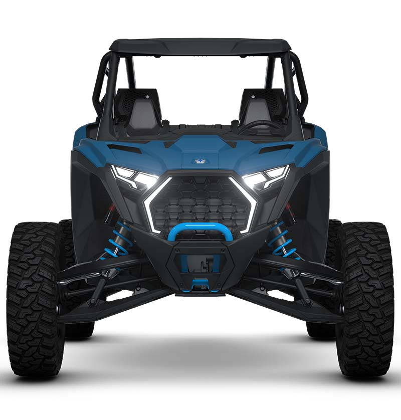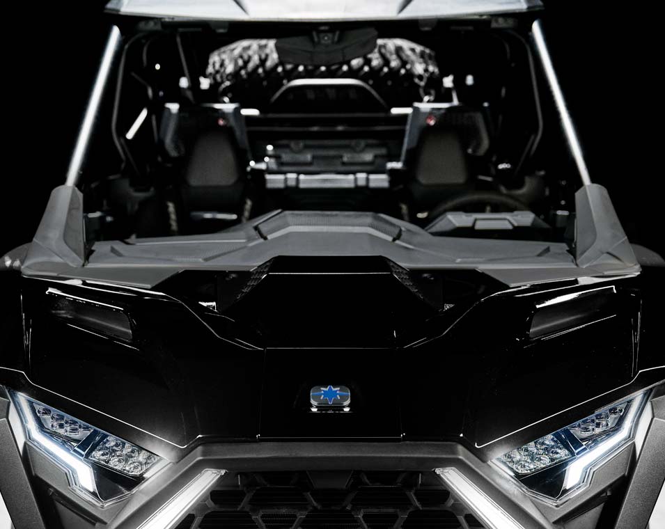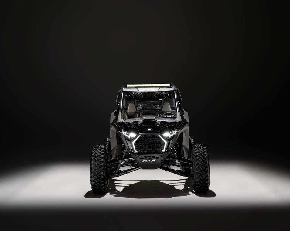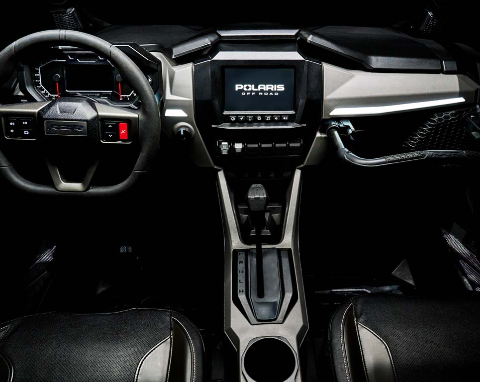 - Signature-animierte RZR Fang-Akzentbeleuchtung; weiße LED-Abblend-/Fernscheinwerfer und rote LED-Rück-/Bremsleuchten; animierte Innenraum-Akzentbeleuchtung